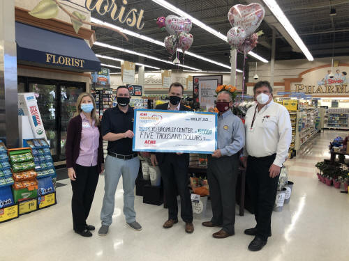 CYO Bromley Center receives $5,000 grant for its Food Pantry through Acme's 130 days of Nourishing Neighbors Campaign. Pictured left to right at the Yardville ACME are: Jennifer Kubicke from Acme, Patrick Hardiman, CYO Bromley Director, Hamilton Mayor Jeff Martin, Tom Mladenetz, CYO Executive Director, and Jeff Miller from Acme. |
